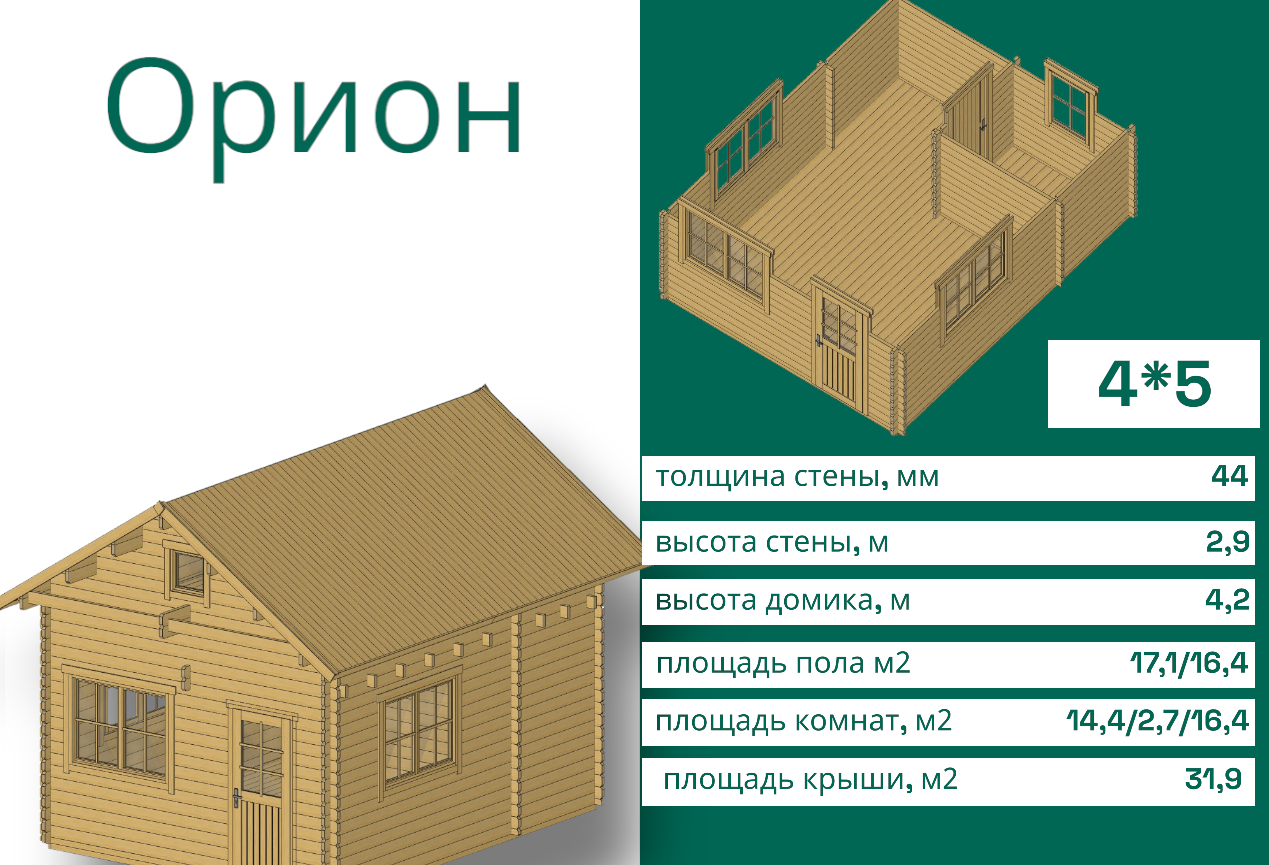 Садовый домик Орион 4х5 толщина 44 мм (готовая комплектация)