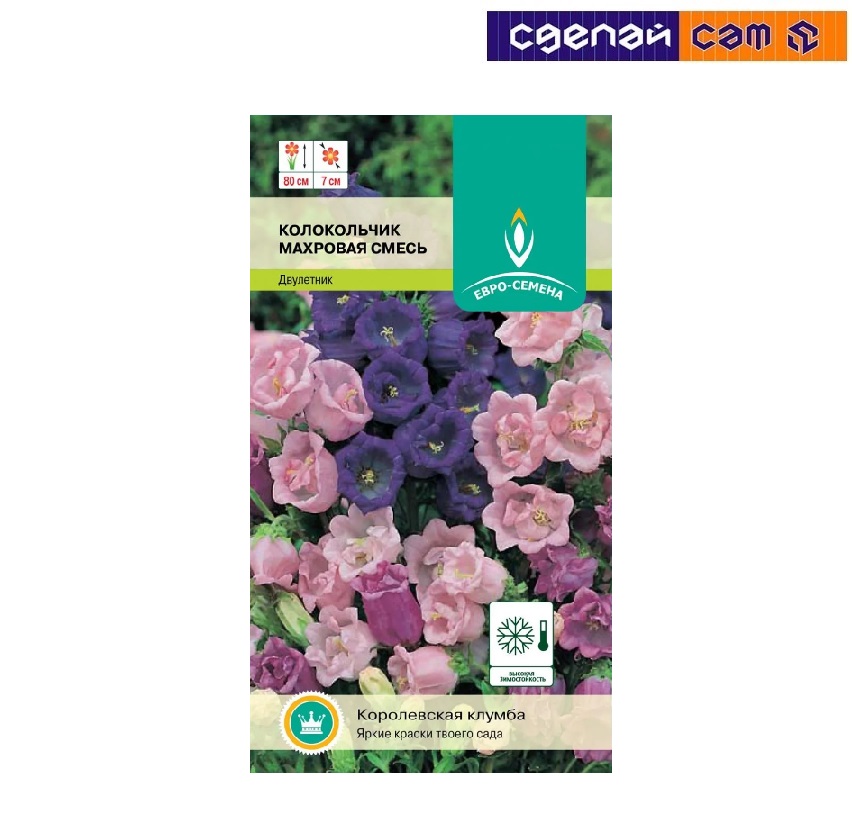 Колокольчик красив в различных цветочных композициях и дает изящный материал для срезки. Эффектный двулетник иногда выращиваемый как многолетник за счёт естественного обновления. Стебель прямостоячий жестковолосистый, высотой до 80 см.Махровые цветки длиной до 7 см и диаметром 5-7 см, собраны в крупные пирамидальные соцветия. Красив в любых композициях, высаживают одиночно или группами на фоне газона, в сборных цветниках, рабатках. Срезанные цветы стоят в воде 10 – 14 дней.