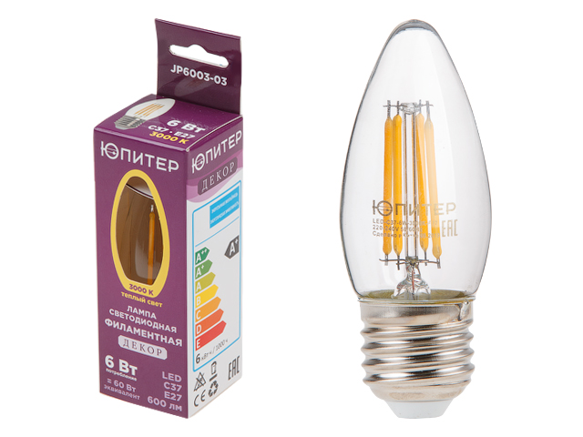 Лампа светодиодная C37 СВЕЧА 6 Вт 220-240В E27 3000К ЮПИТЕР ДЕКОР