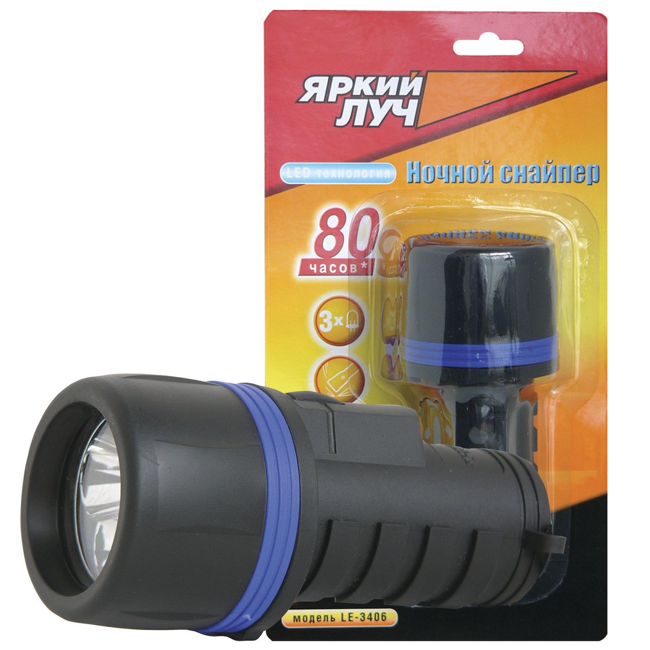 Фонарь ЯРКИЙ ЛУЧ LE-3406 "Ночной снайпер 4AA" резиновый, 3 светодиода, на 4хAA