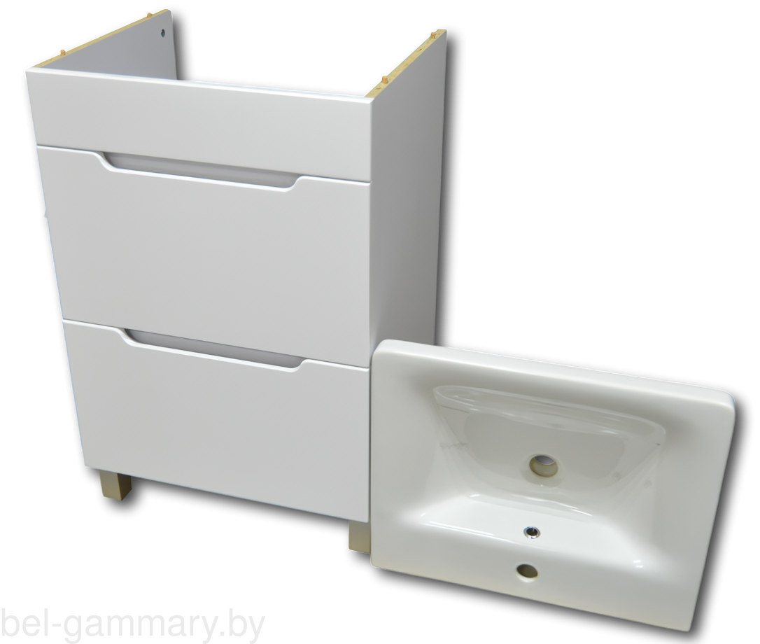 Корпус тумбы изготовлен из ламинированного ДСП 16 мм идеально белого (Аляска) цвета, облицован кромкой ПВХ. Фасады изготовлены из МДФ облицованных пленкой ПВХ белого (высокий глянец) цвета. Тумба укомплектована глубоким умывальником европейского качества производства SANOVIT (Турция).
