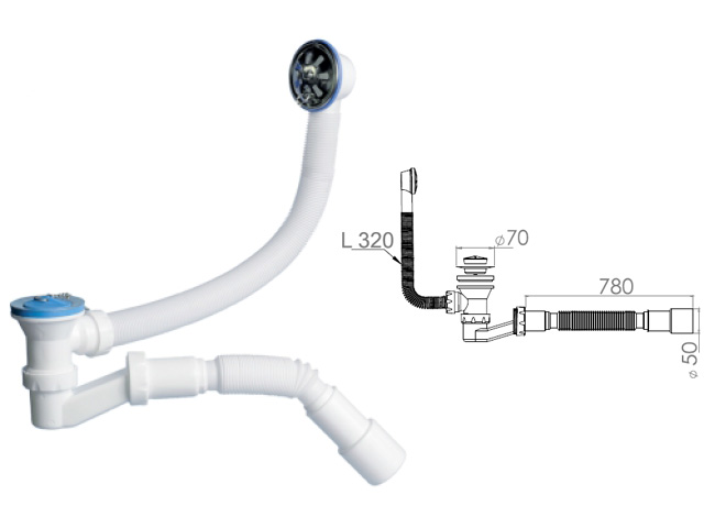 Сифон для ванны низкий h 120mm, с выпуском и переливом 70 мм, с гибкой трубой 40х40/50, AV Engineer, арт.AVE129730