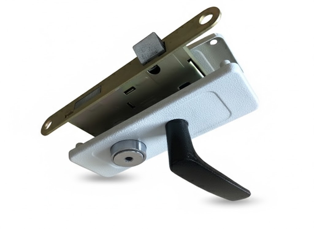 Снаружи дверь запирается автоматически, для этого достаточно нажать на кнопку — центральную часть дискового механизма. Защелка классическая. Ручки покрыты краской черного цвета, материал ЦАМ.